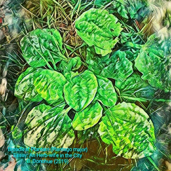 Broadleaf plantain (Plantago major) is commonly found on disturbed soils. It is known as a “camp follower” brought to the North American continent by migrating peoples. The species is native to most of Europe and northern to central Asia. Our ancestors knew of the medicinal gifts of these plants. It’s kind of interesting that so many plants with highly versatile medicinal properties have naturalized and flourished in our country are now called “weeds” in disdain. I easily found it in the front yard of my daughter’s home. Lots of it. Although Broadleaf Plantain can be found where I live, the abundant numbers of them here in the City made my eyes pop. Wow! Look at all of them!