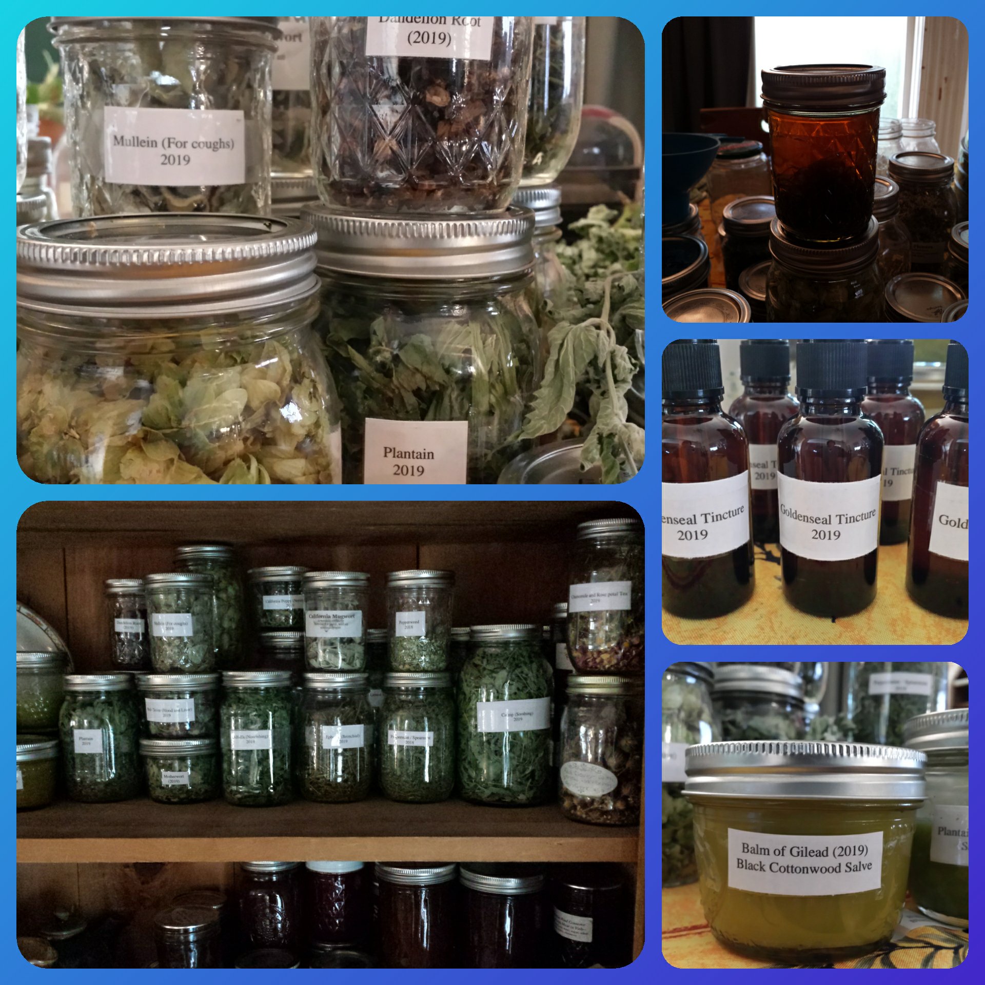 My basic preparations: Goldenseal Tincture (antibacterial, antiviral); Hawthorn tincture (heart health); Black cottonwood salve (inflammation, arthritis pain); Chickweed and Plantain salve (bug bites, rashes, skin irritations); Lemon balm and Feverfew salve (for joint and muscle pain); and Elderberry with Chokecherry syrup (coughs, bronchitis).