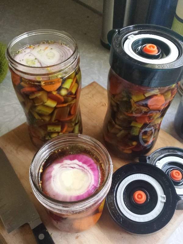 I found myself making up a couple of quarts of pickled asparagus, carrots, celery, peppers, onion and garlic this afternoon. Crunchy fermented veggies are so satisfying to munch on straight from the jar. Fermenting fresh vegetables also extends their shelf life…. So here you go …