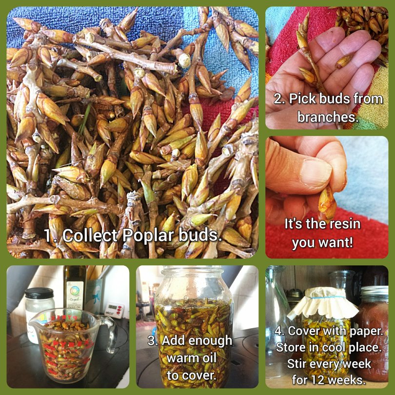 Make sure your buds are always covered with oil. This prevents them from molding. Stir or shake the jar every few days for the first few weeks.To use as an oil, strain through a cheesecloth and put the oil into a wide mouth jar. If you want to make a salve, add 2 tablespoons of beeswax to 1 cup of infused oil. You can add 2 capsules of Vitamins E to make it more emollient. Melt the beeswax into the oil on low heat. Watch carefully. You simply want to melt the beeswax. Stir well and pour into a small glass jar or tin… Do not cover with a lid until it is completely cool…… Happy foraging! Please note: People with aspirin sensitivities or tree allergies may not want to use this salve